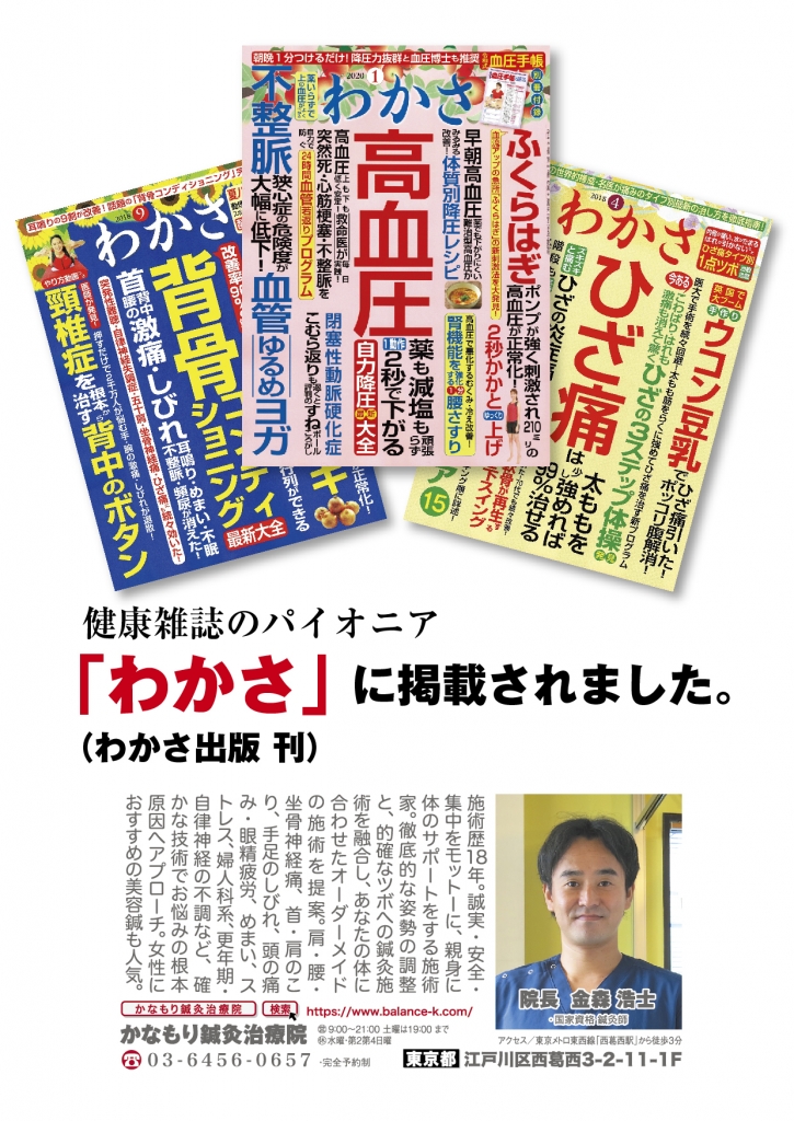 2019年11月15日発売の健康雑誌「わかさ」に「かなもり鍼灸治療院」が紹介されました。