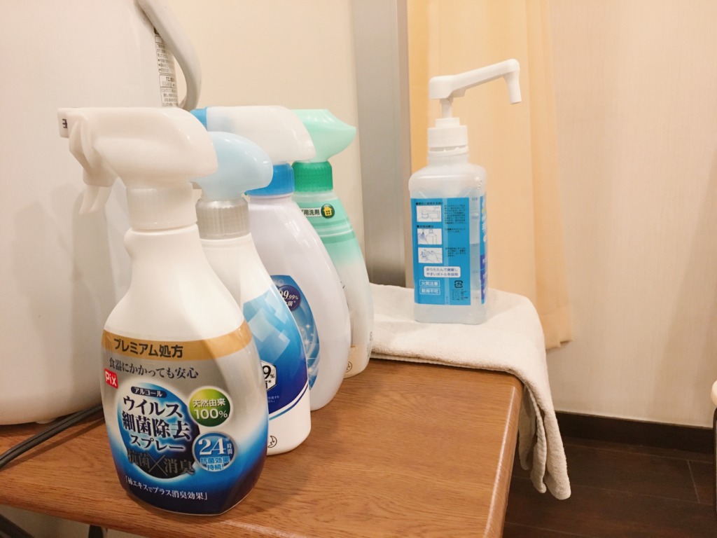 2〜3時間ごとの玄関や待合イス、ウォーターサーバーの消毒
