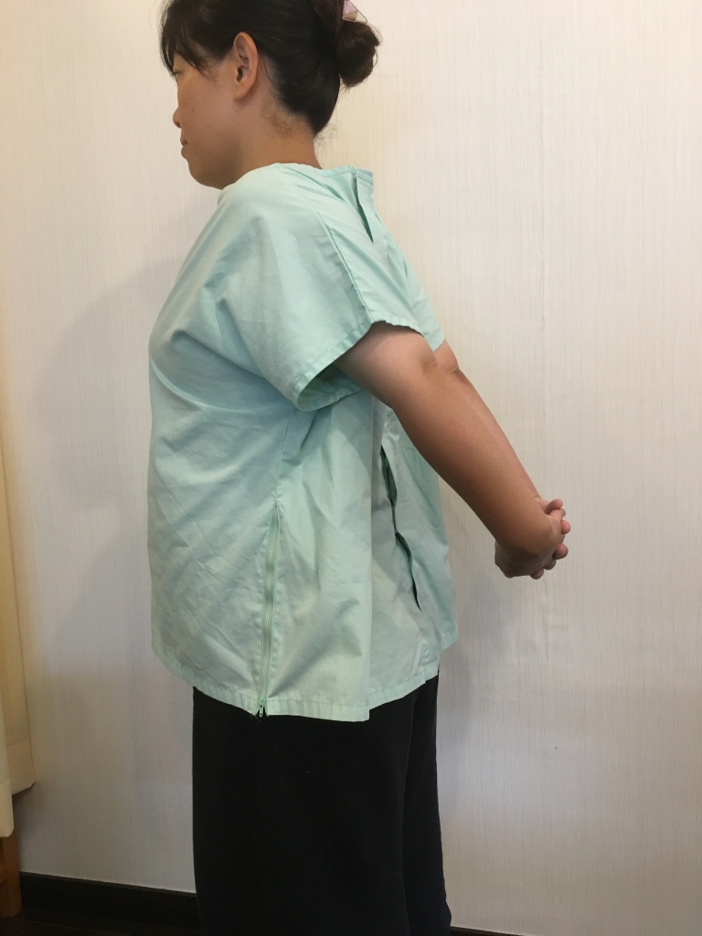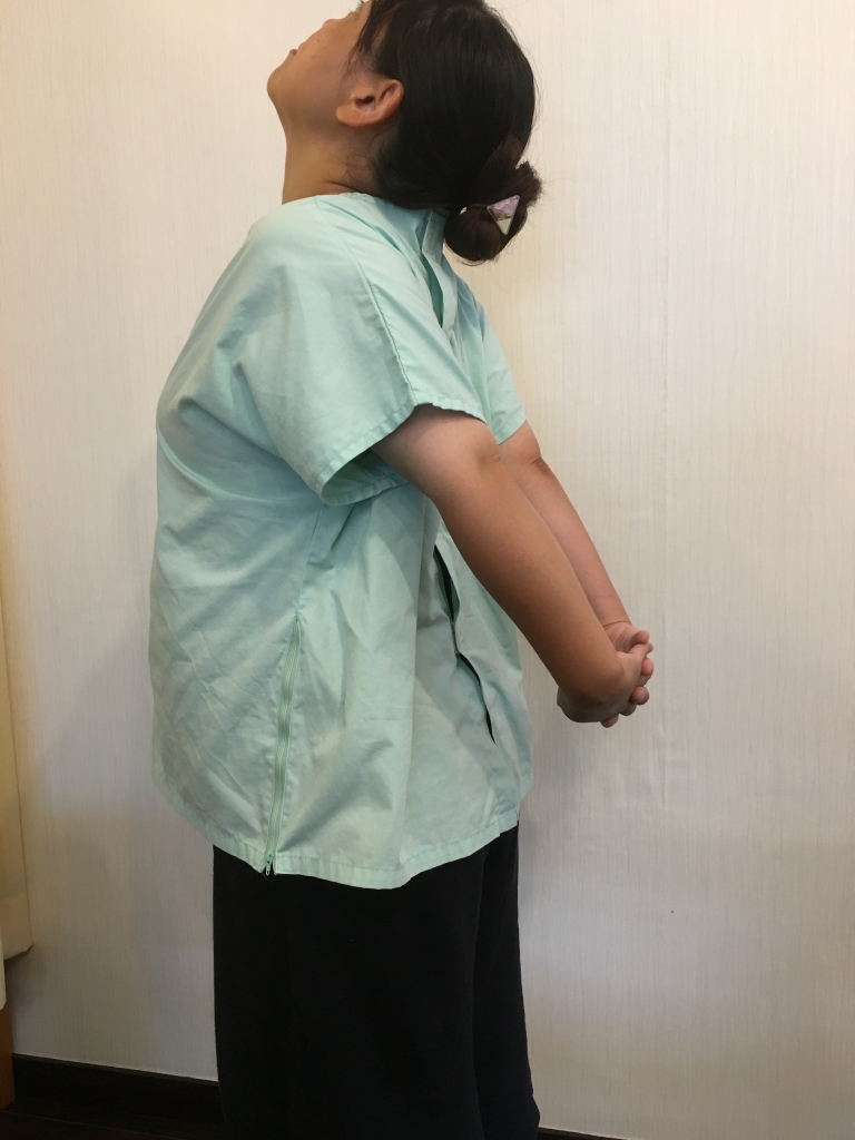 ①直立し腕を伸ばしたまま、背中側で左右の手を組みます